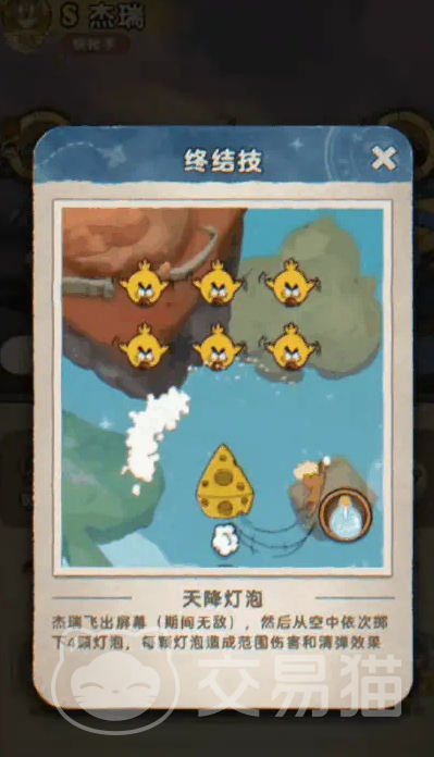 他的终结技“天降灯泡”在使用的时候会飞出屏幕,在这个期间自身处于无敌状态,紧接着会让四颗硕大的灯泡从高空中依次猛烈下砸,每一次下砸都会造成范围性伤害,并且还会额外附加清弹效果。