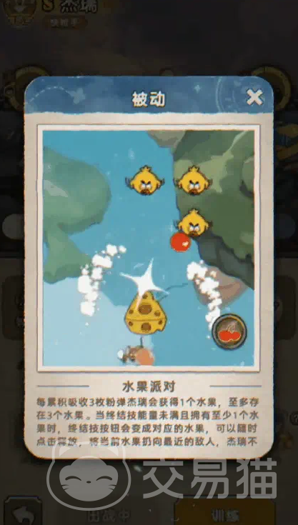 他的被动是每累计吸入三颗粉弹后,就会获取到一个水果,最多可以存三个水果,当自身终结技能量没有满并且手上持有水果时,终结技的按键会变成对应的水果标志,如果是50%几率出现的樱桃会造成2倍特技输出,30%概率出现的普攻会造成3倍伤害,20%几率出现的西瓜会造成夸张4倍输出。