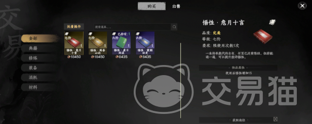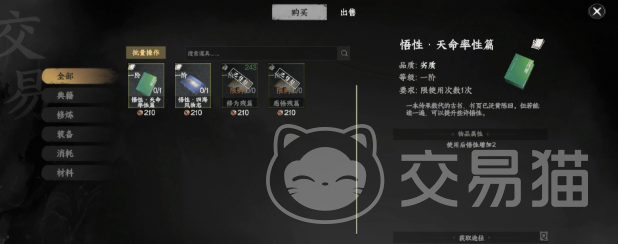 首先第1个方法也是主要途径,就是购买学习,大家可以操控手下角色来到坐标1116,1500处,在这里能看到一个书画商人,找他进行交谈能直接买到加悟性的典籍,比方说“天命率性篇”,这本在拿到使用能提升2点的悟性,当然也可以去723,767处,找到柯昭阳购买他的银气散和亦夜丹,这两种丹药总共能提升7点。