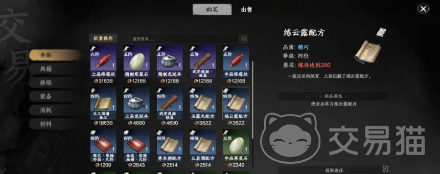 和他对话购买炼云露的配方,买到后就可以去获取炼丹材料开始炼制,需要注意如果炼丹的经验不够炼制,一定要提前买好低阶配方来多次炼制提升,除了这一丹药外,吉玉折树丹也有加悟性效果,该配方在成为凌云门关门弟子后可兑换。