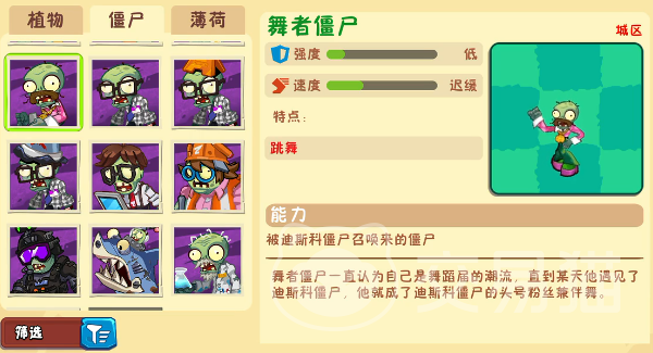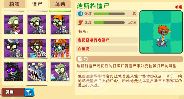 迪斯科僵尸有一定的感染扩散能力,914点血量基础上每10秒召唤4个伴舞僵尸的设定,形成了人海战术,新一代版本缩短的召唤间隔使这一威胁倍增,需尽早部署毁灭菇实施范围打击,或用冰冻生菜打断舞蹈节奏。