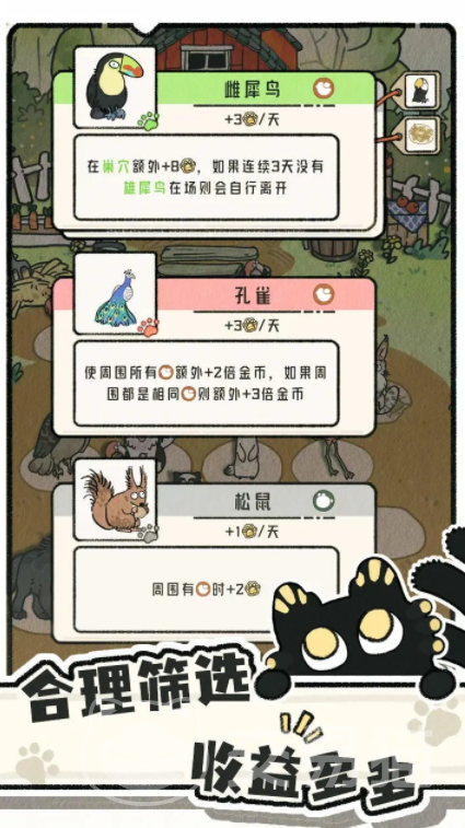 作为牧场的管理者,除了战斗之外,玩家还需要在游戏里不断进行各种经营决策的制定,需要合理的安排这些动物在场景里的布局,以及每一个动物之间的相生相克关系,否则会导致这些动物数量的锐减,后期有了足够多的资金之后,还可以用来购买更多特定的道具或者动物,能让整个团队都有更加优秀的能力。