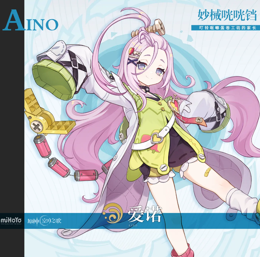 爱诺的普攻会用大剑进行连续3段的挥砍,重击会消耗体力持续选装大剑,并在停止时发动一次强力挥砍,她的战技“水冷仪”会丢出特制的喷水机关,在机关存在的期间会间歇性对附近的敌人发射出水弹,形成水元素输出。