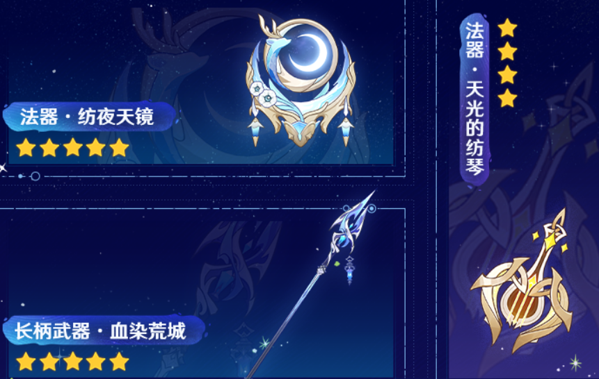 预计将加入数款与挪德卡莱元素相契合的新装备,包括7把4星可锻造武器,另有任务与活动可赢取的免费武器。有专为“月反应”设计的2套新圣遗物,一套强化暴击率与月反应伤害;另一套提升元素精通,适合支援定位。