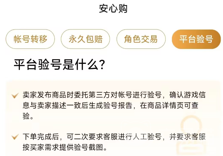 官方验号服务能够证实账号所拥有的信息都是真实有效的,数据如皮肤、英雄、段位等均由平台核实,通过审核的商品都是可以获取到独立编码的验号报告。此外带有“安心购”标识的账号享有权威的售后保障服务:一旦发生了账号被找回、封禁等非买家责任问题,平台将按规则进行赔付或退款,极大降低了购买高价值账号的风险。