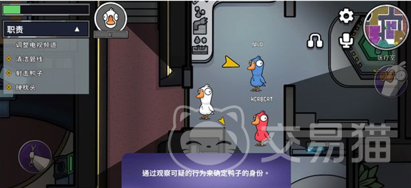 游戏的独特之处就在于角色技能还有任务的交互性。鹅阵营主要的任务就是修理装备,还有收集物品。当然也有一些趣味性的小游戏,例如破解密码。鸭阵营主要是利用通风管道来迅速的移动,还可以放置炸弹去制造混乱。部分的角色还会有一些特殊的技能,例如隐身暗杀,还有伪造身份。中立角色的技能更是脑洞大开,例如秃鹫就可以直接吃掉尸体,然后去掩盖自己的行凶痕迹。刺客在讨论阶段就可以直接开枪,把怀疑自己的玩家全部的杀掉。