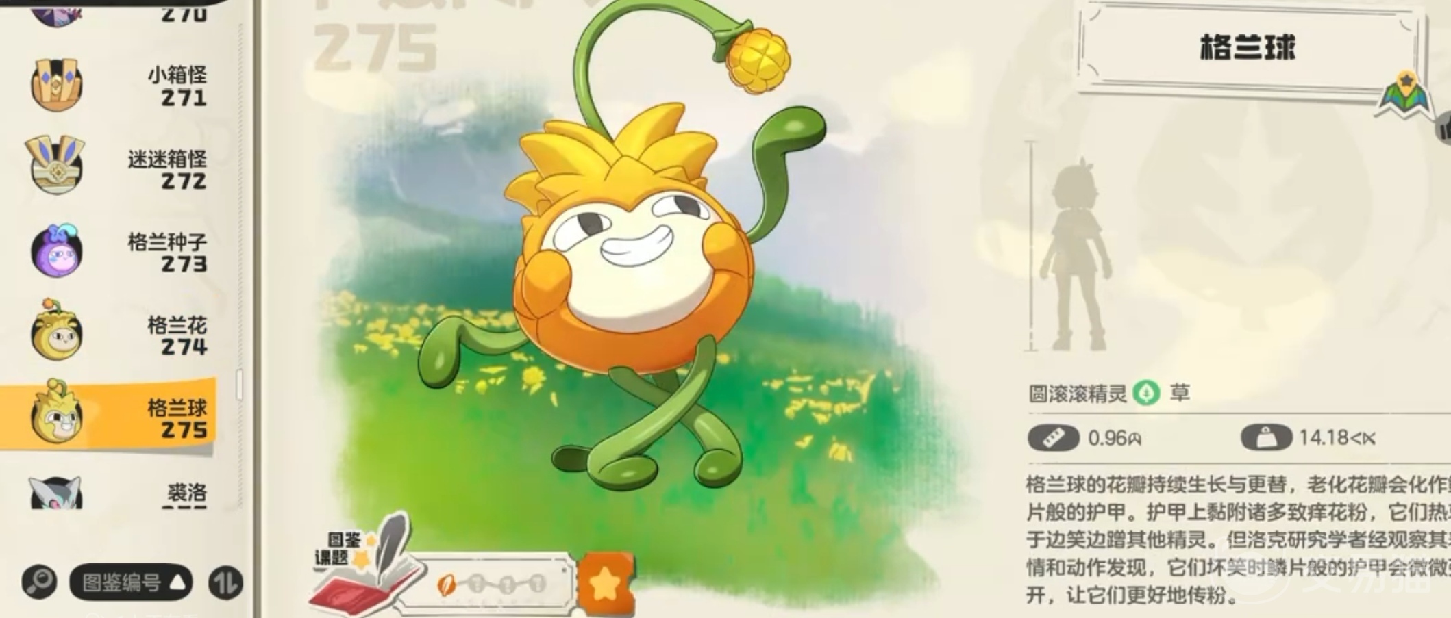 第六位:格兰球 ,双草属性,对土系精灵克制明显。特性是 “生长” ,能够让格兰球每回合结束后都恢复 12% 生命值,续航能力是非常不错的,车轮战和消耗战中能发挥极其出色的表现,可在命运对决模式中先上场消耗对手。可通过捕捉格兰种子培养获得,格兰种子等级低,捕捉难度小,在回填山涧的魔力之源可找到。