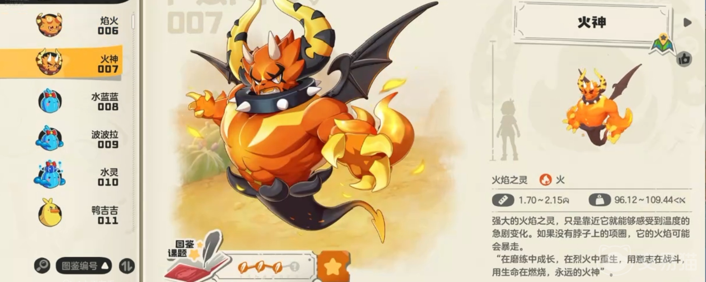 第一位:火神 ,作为初始精灵,培养成熟后种族值能达到 626,攻击力和攻击速度兼具。其 “炽焰审判” 技能对草、冰、虫系精灵的伤害是特别高的,尤其是在搭配上 “火焰增幅” 特性,便可以大幅度去提升火系技能的威力,在PVP战斗中可以快速清场,最重要的是火神的获取方式足够简单,只要通过推进主线剧情就能获得。
