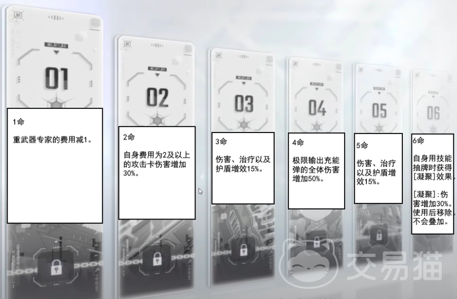 该角色支持六阶段等级成长。1级时,“重型武器专家”技能所生成的卡牌费用减少1点;2级时,所有费用2点及以上的攻击类卡牌伤害提升30%;3级时,伤害、治疗与护盾效果均增强15%;4级时,“极限输出充能弹”的群体伤害进一步提升50%;5级时,伤害、治疗与护盾的增益效果再次提升15%;6级解锁被动能力:每当通过技能抽牌时,获得“凝聚”状态,使后续伤害提高30%,该效果不可叠加,使用后即清除。