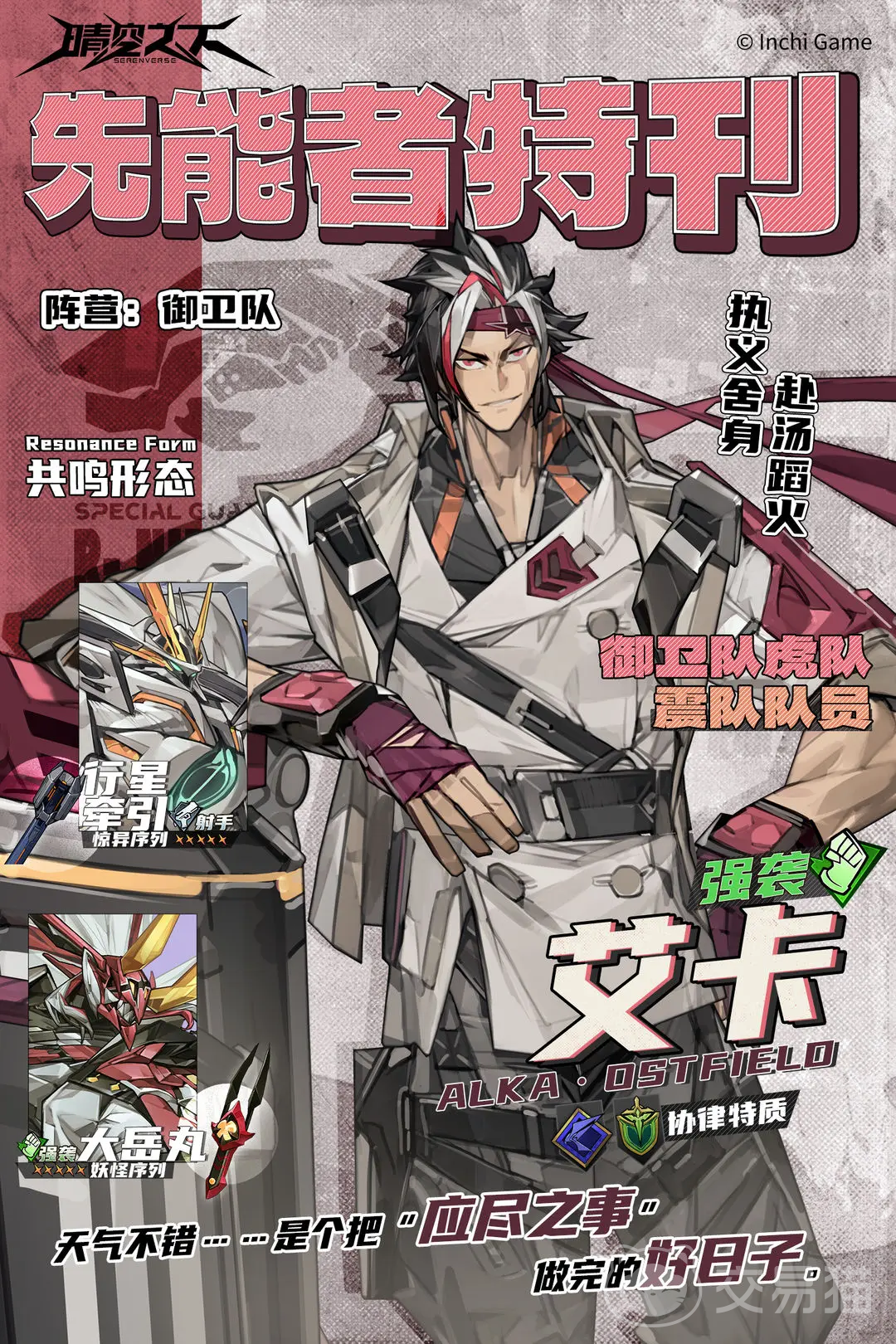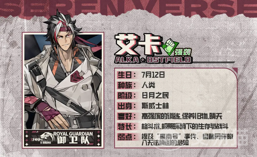 艾卡作为御卫虎-震队的核心成员,性格直率且行动果断,重情重义是他最鲜明的标签。在他的认知中,人际关系极为清晰——要么是并肩作战的伙伴,要么就是无关紧要的旁观者。作为一名定位明确的强袭型英雄,艾卡在《晴空之下》中的实战表现备受玩家期待。接下来,我们将深入解析他的技能机制与战斗定位,帮助大家全面了解这位新晋战力。