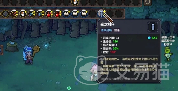尽管“光之柱”初始定位为防护技能,但其实际战斗潜能远不止于此。一旦与“脐带”建立连接,便可转化为极具破坏力的输出手段。即便未进行星级升级或额外强化,基础状态下的“脐带+光之柱”组合也能实现每秒约30点的稳定伤害,在游戏前期阶段已具备显著压制能力。