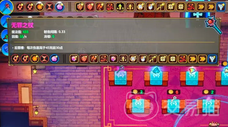 法杖是游戏中最主要的战斗工具,其属性结构由四大模块构成。顶部的白色数值代表基础属性,决定法杖的基本性能;下方的黄色文字为动态附加词条,随装备生成而变化,影响实际表现。紧接着的是圆形插槽,用于装配主动释放的法术技能,而末端的方形槽位则专门用于添加后缀强化效果。其中,魔法值尤为关键,它决定了角色可使用的法力总量。在未获得特定遗物之前,角色施法完全依赖法杖所提供的魔法支持。