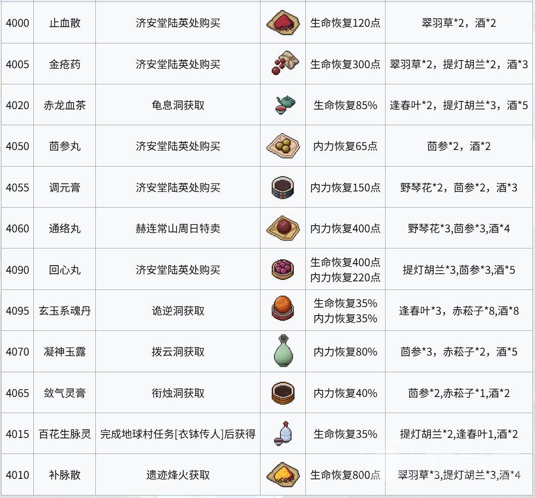 所获材料中,茴参在制药系统中占据重要地位。其可参与制作多种功能性药品:与酒类材料合成可制成茴参丸,服用后恢复65点内力;加入赤菘子与酒则能炼制敛气灵膏,提供持续1小时的10%攻击力加成;搭配野琴花和提灯胡兰则可炼成高阶恢复丹药玄玉系魂丹,一次性恢复35%的生命值与内力值。逢春叶适用于持续回复类药剂的炼制,而禽蛋除用于烹饪外,在部分剧情事件中也具备独特用途。具体配方如下:茴参丸(茴参×2+酒×2→恢复内力65点)、敛气灵膏(茴参×2+赤菘子×1+酒×1→攻击提升10%/1小时)、玄玉系魂丹(茴参×2+野琴花×2+提灯胡兰×2→恢复35%生命内力)。