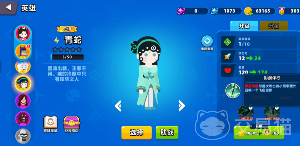 游戏中英雄按稀有度划分为不同等级,其中最受推荐的是传奇品质的白蛇,该角色可升至五星满级,最高可提升至100级。初始获取时为1级状态,随着等级提升,其攻击力与生命值均会显著增强。白蛇不仅成长性优秀,操作门槛也较低,非常适合新手玩家使用。战斗中她可展开纸伞,有效抵挡来自远程的弹幕攻击,无论是面对PVP对手还是挑战BOSS,这一防御机制都能大幅提升生存能力。此外,青蛇同样是五星英雄之一,但稀有度为史诗级别,等级上限同样为100级,整体强度略逊于白蛇。