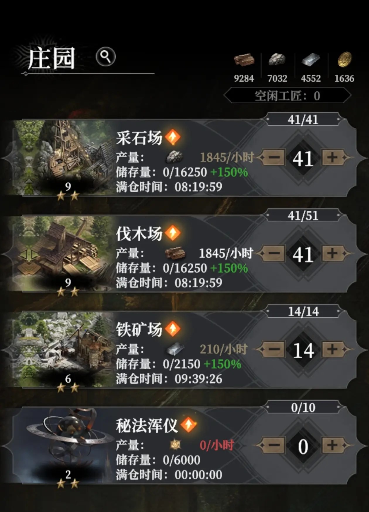 值得注意的是,庄园的资源产量会直接影响可分配匠人的数量。匠人主要通过冒险途中解救获得,但若仓库存储达到上限,所有生产活动将自动暂停,即使有足够工匠也无法继续运作。因此,在升级各类生产建筑的同时,务必同步提升灵质炉等级,以扩大整体仓储容量,避免资源浪费。