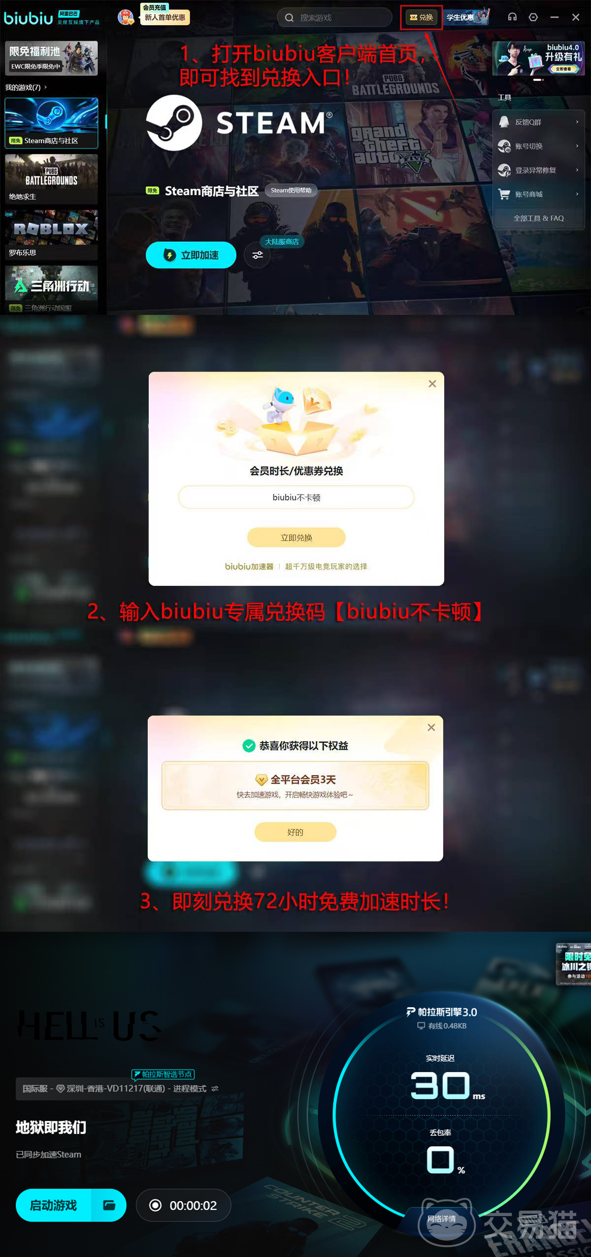 在持续优化核心技术的同时,该加速服务也注重用户体验升级,携手知名电竞选手Aixleft共同参与产品测试与反馈调优,进一步提升操作便捷性与连接稳定性。目前新用户注册即可获赠24小时免费加速时长,同时输入指定兑换码【biubiu不卡顿】,可在客户端首页额外领取72小时免费使用权。两项福利可叠加使用,总计可达96小时,助力玩家无忧体验游戏初期内容。