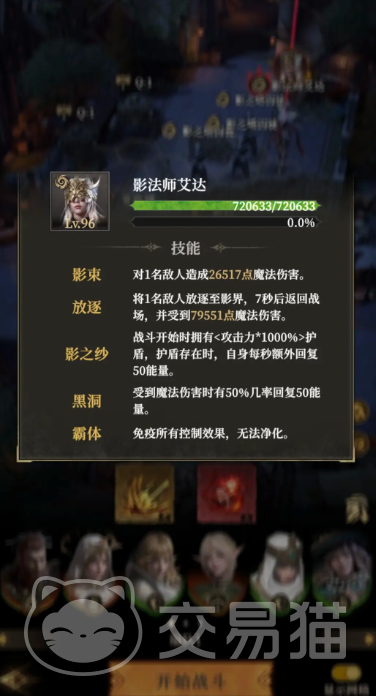 影法师的核心技能包括“影束”,可对单体目标造成26517点魔法伤害;“放逐”则会将一名角色送入影界,并在7秒后返回战场时承受高达79551点的魔法伤害,属于典型的高爆发斩杀技;“影之纱”使她在战斗初始阶段获得强力护盾,且在护盾存在期间每秒回复50能量;此外,“黑洞”机制让她在受到魔法伤害时有50%概率回复50能量,配合其霸体状态免疫所有控制效果,整体机制极为棘手。
