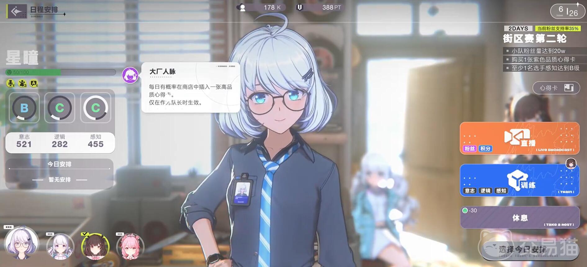 在游戏进程中,玩家每日需为所管理的虚拟主播规划日程,主要围绕直播、训练和休息三项活动进行决策。参与直播可提升粉丝数量并积累直播积分;训练则用于强化角色的意志、逻辑与感知等战斗相关属性;而休息有助于缓解压力值,避免因压力过高导致训练效率降低或触发不利事件。这四项关键数值——粉丝数、意志、逻辑、感知及压力水平——将直接影响角色在战斗中的表现,例如意志影响技能释放频率,粉丝数则提供士气增益。