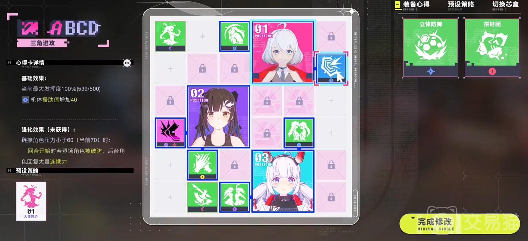 除了常规的日程管理,游戏中还设有多种随机职场事件,如公关危机处理、粉丝互动任务等。不同的选择不仅会影响角色之间的关系发展,还可能改变其战斗风格,并解锁隐藏剧情内容。战斗采用3对3自动回合制模式,战前需要根据角色属性克制关系合理配置阵容,特定组合还能激活合体技。通过直播获得的积分可用于购买心得卡,并将其装配至芯盒系统,从而为角色赋予额外被动效果或主动技能加成。