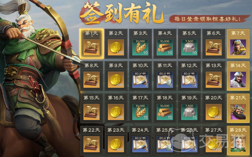 这是一项周期性签到活动,玩家只需每日完成签到即可获取资源奖励。在第7天、第14天、第21天以及第28天,还可额外领取橙色品质武将,持续参与收益可观。