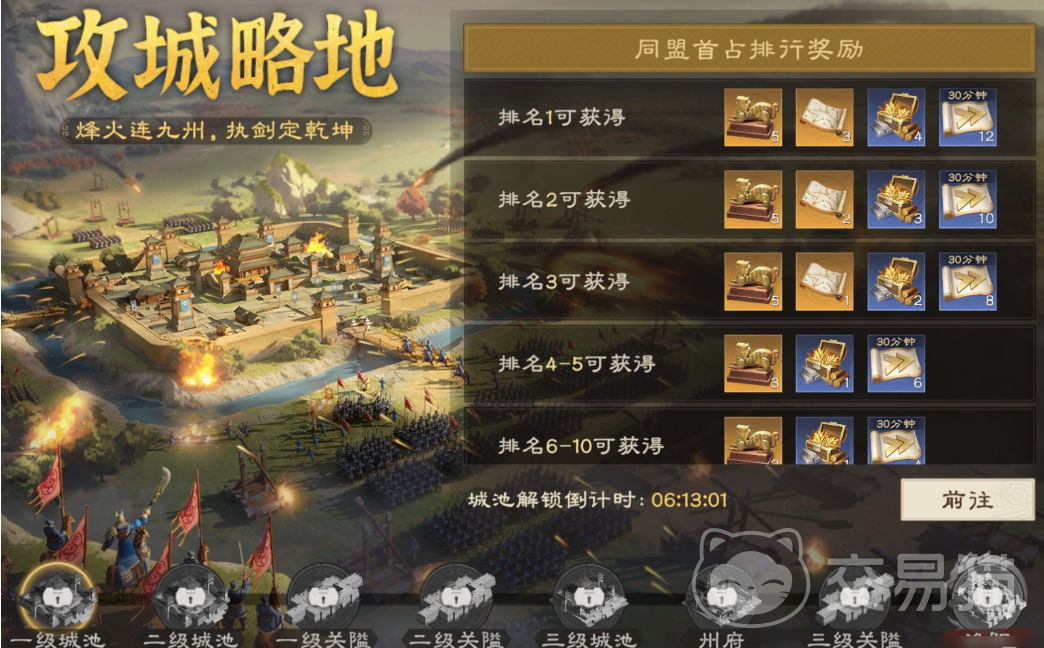 当同盟首次成功占领某一类城池后,系统会将其纳入排行榜统计范围。根据最终排名,所有同盟成员均可获得相应奖励,强调团队协作的重要性。
