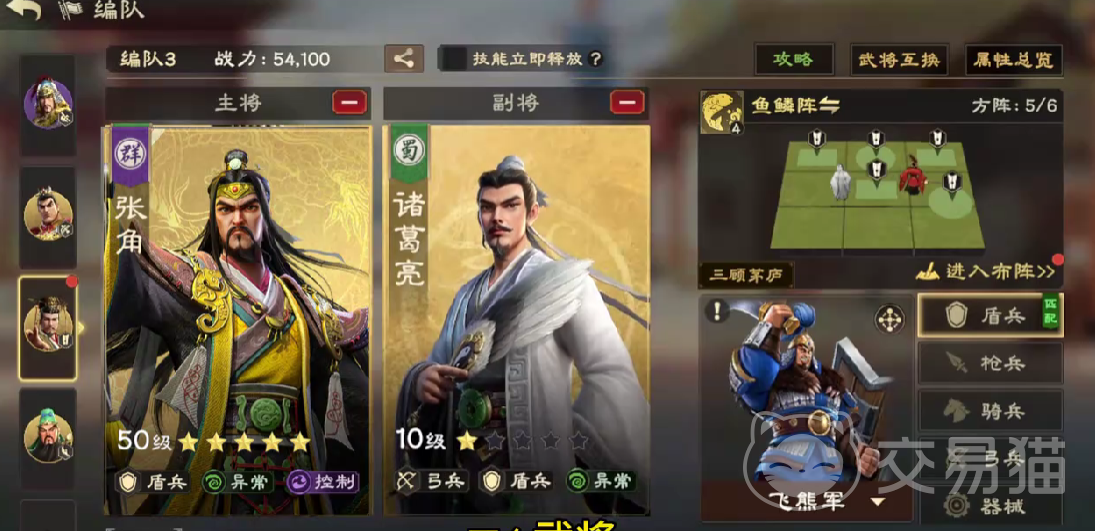 在军阶培养方面,建议选择“异常”专精,可延长部队施加的异常状态持续时间。进入游戏后期后,可将阵容中的刘备替换为张角。张角与诸葛亮均具备触发异常伤害及增伤效果的能力,二者协同作战能显著提升整体输出效率,形成顶级异常流盾兵阵容。阵法推荐优先使用鱼鳞阵,该阵法不仅增强异常伤害,还能为武将提供回怒加成,进一步加快技能循环。
