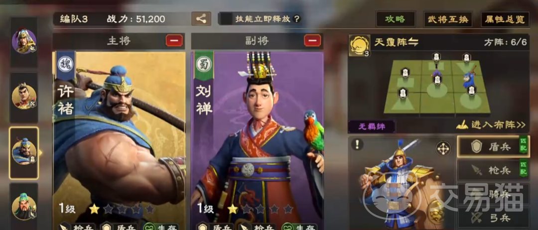 推荐搭配许褚与刘禅组成生存型盾兵阵容。军阶专精选择“生存”,可进一步提高部队的伤害减免能力。游戏后期可将刘禅替换为刘备,许褚凭借其高额防御属性,能够最大化放大刘备的治疗收益,形成坚不可摧的防御组合。阵法方面首选天覆阵,若暂未解锁,可使用长蛇阵作为替代。天覆阵作为多数盾兵阵容的首选布阵,配合许褚的被动技能,有助于维持全队兵力的持续稳定。