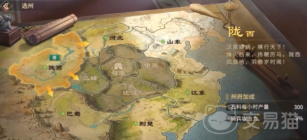 陇西地处高原与山地交汇地带,地形复杂且石料资源丰富。该州每小时可额外产出超过300单位石料,极大缓解了建筑升级过程中的材料压力,助力城池快速扩张。在兵种方面,陇西为骑兵提供3%的攻击力加成,适合偏好高速突袭与机动作战的玩家选用。