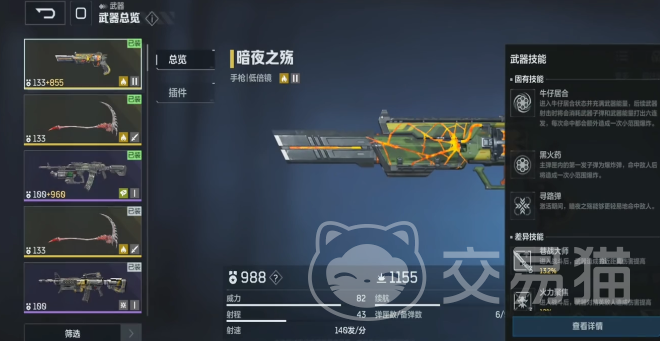 主武器推荐使用暗夜之殇系列手枪,该类型武器具备天然高暴击率优势,无需额外堆叠暴击概率属性,重点在于提升暴击伤害值,从而提高单发子弹的极限输出能力。在配件选择上,应避免装配暴击类组件,以防资源浪费和属性冗余。建议优先配置2号插件,可在短时间内完成36发子弹的连续射击,同时加快换弹速度,保障持续火力输出的稳定性,后续应及时进行等级强化以发挥最大效能。