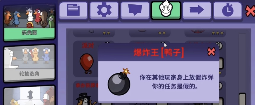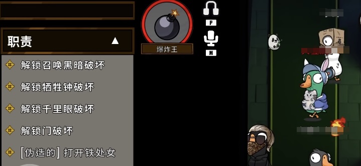 作为鸭子阵营的一员,爆炸王的核心目标是消灭所有鹅阵营成员或阻止他们完成任务。该角色不具备近战击杀能力,而是依赖于布置炸弹来达成目的。具体操作为接近目标后安放炸弹,被放置炸弹的玩家头顶会出现倒计时提示,同时会听到持续的“滴答”声,表明爆炸即将发生。