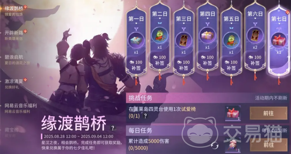 本次节日活动中,最受关注的当属“缘渡鹊桥”限时任务。在活动期间,玩家每日登录并完成指定目标即可领取专属奖励。任务内容包括在蓬莱岛使用试爱椅,或在对战中累计造成5000点伤害。虽然任务具有一定挑战性,但完成后的回报非常可观。成功达成条件后,可获得极品挂饰、织锦福袋以及限时增益效果等多种奖励。这些奖励不仅能提升角色外观表现,还能增强实战能力,让玩家在战斗中更具优势。