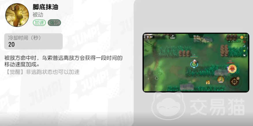 被动技能“脚底抹油”在被命中后脱离战斗状态时,会触发移速加成,大幅提高逃生能力。觉醒后即使未处于受击状态,也能获得加速效果,使得撒谎布在战场上的机动性更强,便于调整位置规避技能,提升整体生存率。