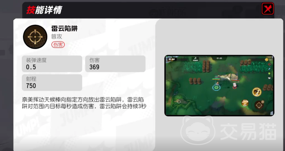 奈美的普通攻击名为“雷云陷阱”,使用天候棒向指定方向释放一个持续3秒的雷云区域,期间每秒对范围内的敌方单位造成固定数值伤害,适合用于封锁走位或消耗对手血量。