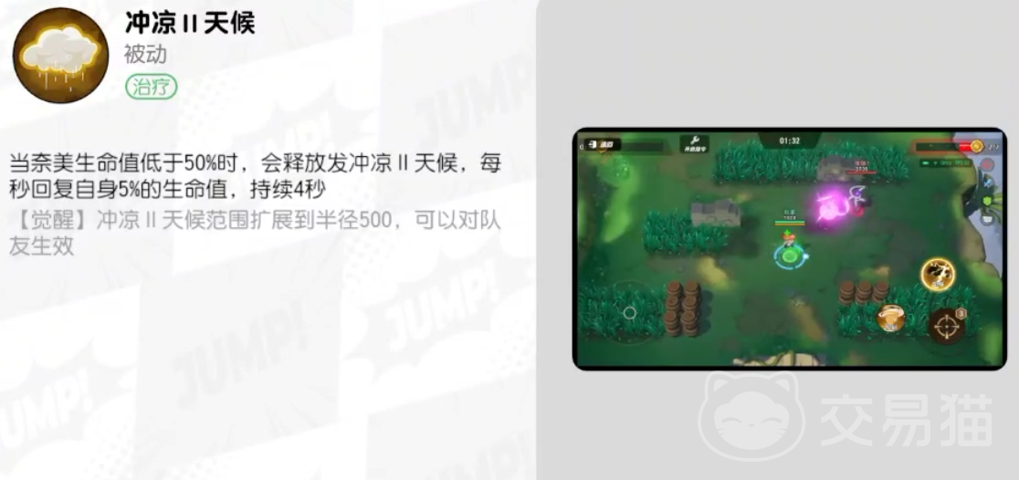 被动技能“冲凉”在奈美生命值低于50%时自动触发,生成治疗气候,使其自身每秒回复5%的生命值,持续4秒。觉醒后该效果范围扩大,并可惠及周围队友,显著增强团队在持久战中的生存能力。