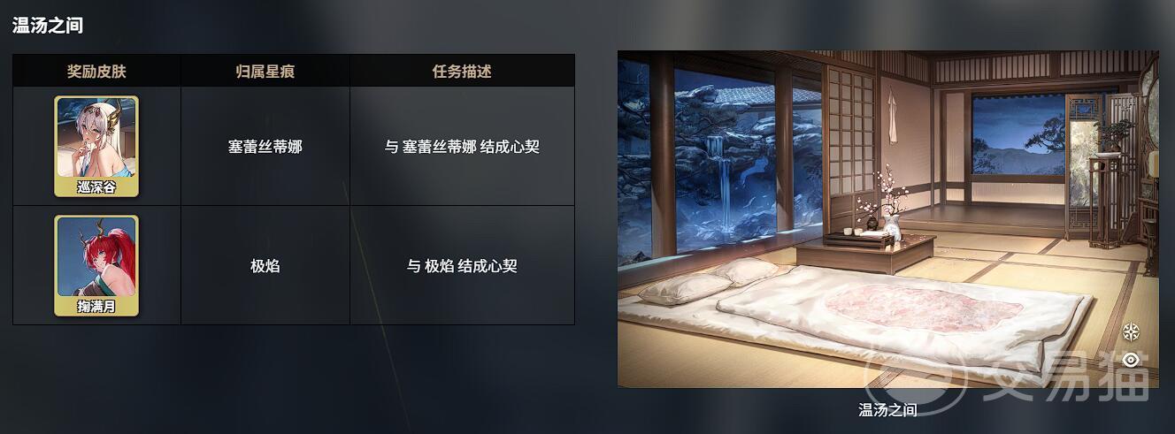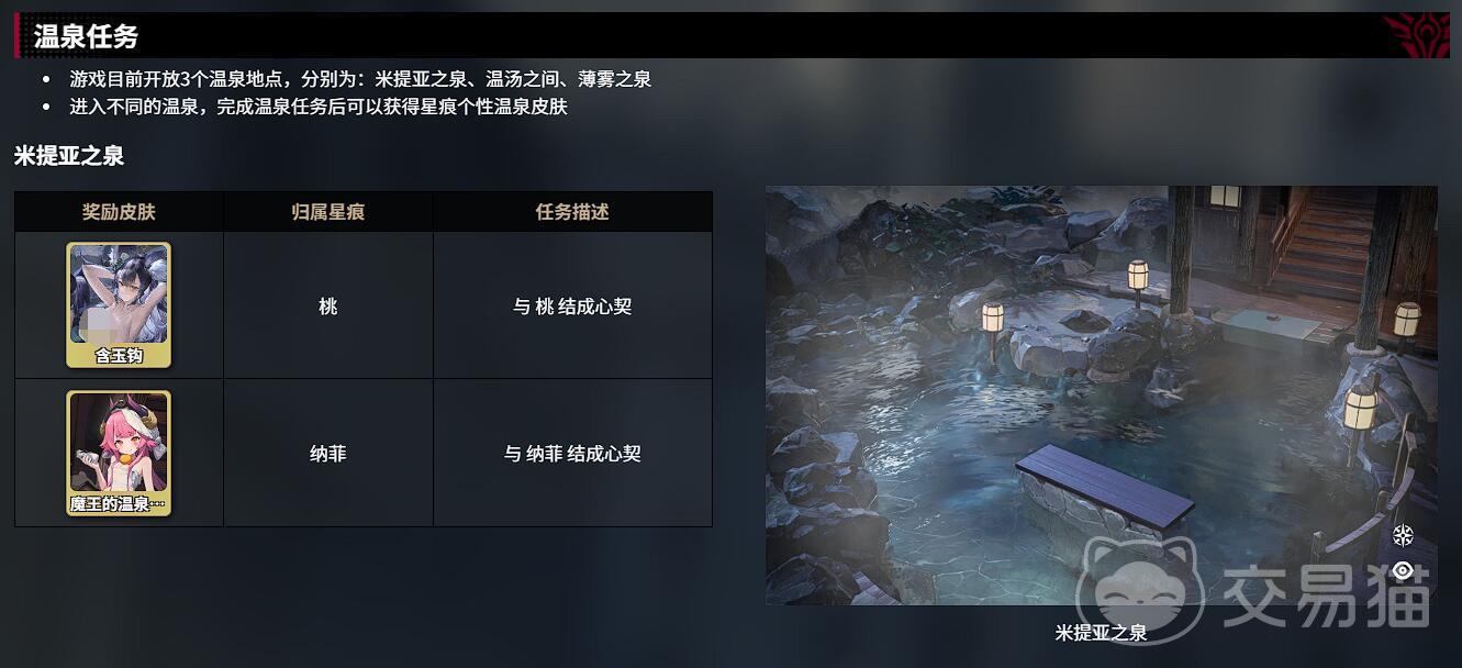 游戏中设有三大主题温泉区域:米提亚之泉、温汤之间与薄雾之泉,每个地点关联不同的星痕角色及其专属任务线。以米提亚之泉为例,其涉及桃与纳菲两位角色,需与其缔结心契方可解锁“玉钩”与“魔王请帖”两款限定皮肤。心契达成需经历两个阶段:首先通过赠送七色铃兰或千纸鹤等礼物,或将目标星痕编入战斗队伍协同作战,将其好感度提升至5级;随后在温泉界面触发专属剧情,并在对话中做出正确选择,方可完成缔结。成功解锁的皮肤可在“星痕-外观”页面自由切换,部分款式还附带战斗属性增益。