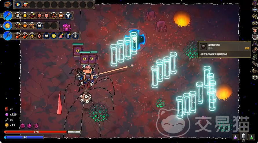 毒蛛之卵:拥有三种主要攻击手段——原地释放毒池、空中追击喷射毒液、投掷带毒滚石。前两种可通过沿墙移动规避;第三种较为棘手,尤其在无召唤单位协助的情况下难以闪避,且残留毒液会影响走位。建议配备护盾类道具以增强生存能力。总体来看,第一关难度适中,采用召唤流派可稳定应对,推荐新人玩家优先构建召唤体系,强化相关法术与遗物,为后续章节打下基础。