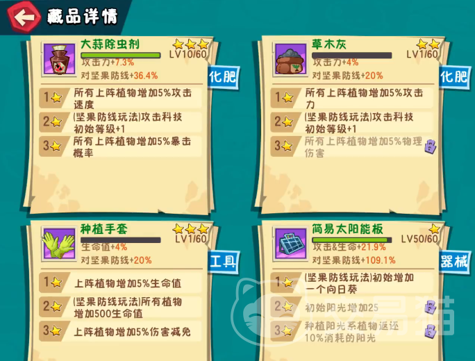 实战配装方面,推荐携带3星种植手套和2星或以上的松土助手,前者可提升上阵植物的生命值,后者则增强治疗效果。搭配简易太阳能板,可在开局额外提供一个向日葵,加快阳光积累速度。草木灰与大蒜除虫剂可根据星级情况选择携带1件或全部装配,若能达到2星最佳,有助于提高植物输出能力。此组合在生命、防御、攻击及坚果防线四个方面均有均衡提升,适用于多数中前期关卡,待后期获取更强力的橙色藏品后可逐步替换同类低阶装备。