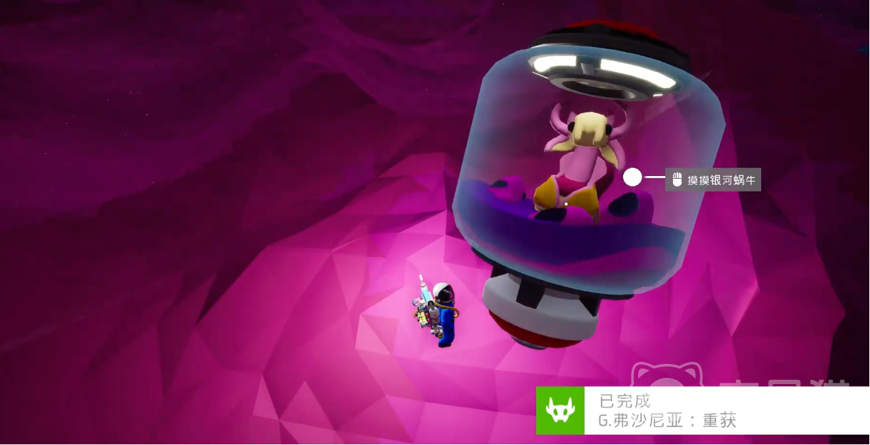 开启银河蜗牛任务后,玩家会获得一个奇异物体,该物体需在无遮挡的开阔区域展开——可选择地表或地心位置,展开后即形成生物实验室。随后使用指南针扫描星球上的蜗牛壳,以获取微型花园装置。向其中添加必要材料与喇叭组件,并播放“无法触及的舞步”来提升互动好感。当好感度达标后,对准花园按下F键执行“友好”动作,即可成功捕获银河蜗牛。