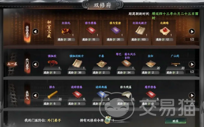 进入门派只是起点,真正的挑战在于后续的晋升之路。从内门弟子到掌门之位,每一阶段都对诡辞属性提出了更高的要求——从240起步,逐步提升至600。除了属性达标,还需完成特定任务来推动进度。提升诡辞的主要方式之一是前往贡献堂主苓儿处,使用资源兑换相关修炼书籍。此外,通过执行悬赏任务或消耗铜钱获取令牌,也能有效增强个人实力与门派地位。