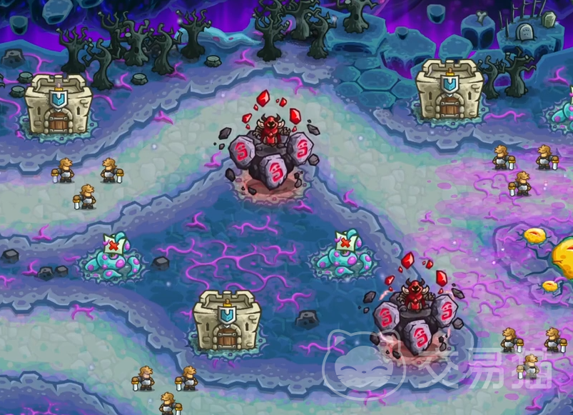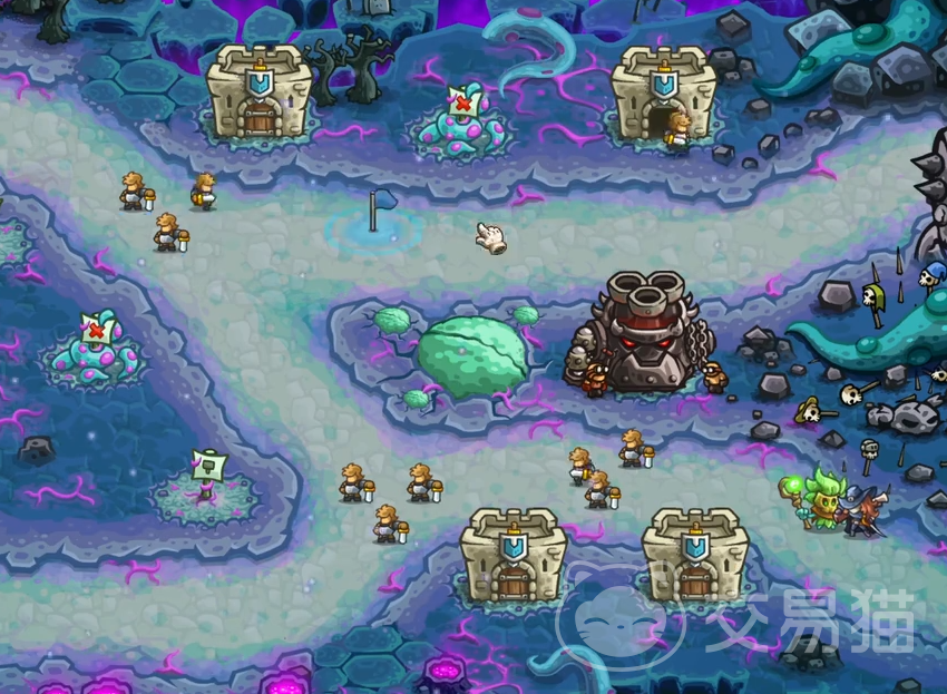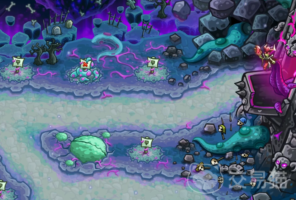 开局后,首先应将英雄部署在下方恶魔之塔入口前方的关键节点,用于第一时间拦截地面部队。紧接着,在塔左侧中部位置建造一座加农炮,利用其范围伤害有效打击成群推进的敌人。由于前期敌军密度较大,加农炮在此阶段能发挥极高的清兵效率,建议优先进行升级以增强输出能力。