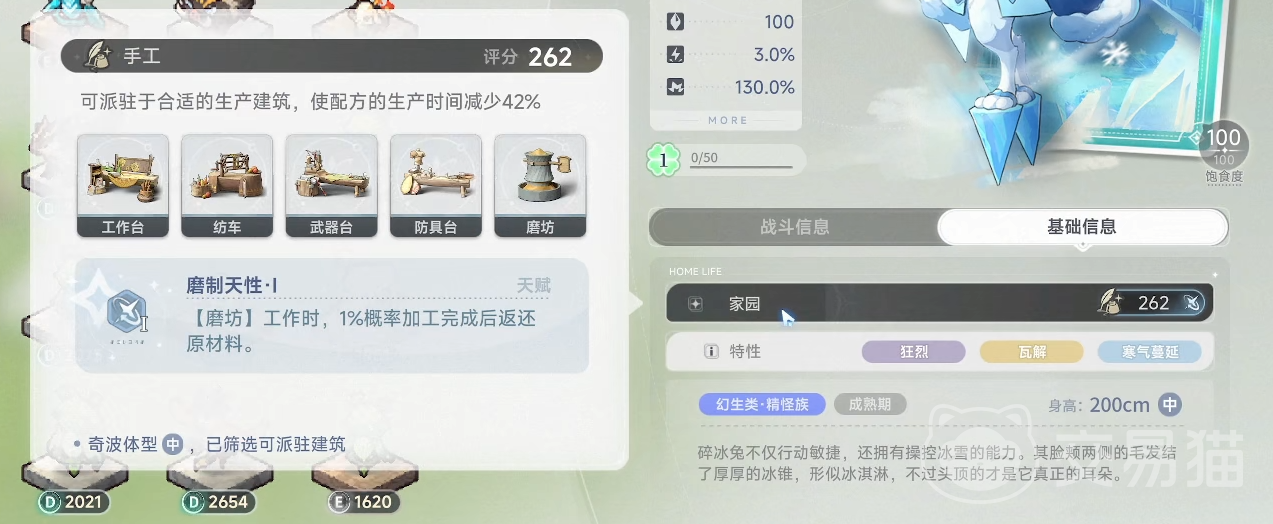 在非战斗场景中,碎冰兔适合派遣至手工类设施如磨坊进行驻留,有一定概率在加工完成后返还原材料,提升资源利用效率。战斗特性方面,其拥有狂猎、瓦解、寒气蔓延三项专属状态,不仅能大幅提升自身攻击力,还能进一步削减敌人的防御力与移动速度,并减少己方受到的冰属性伤害,增强战场适应性。