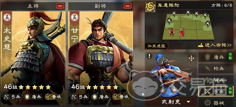 第一套为甘宁与太史慈组成的高爆发速攻阵容。这两位武将凭借自身极高的暴击潜力,成为输出端的强力组合。甘宁自带高暴击属性,配合太史慈持续稳定的伤害释放,能够在短时间内压低敌方血线。激活“江表虎臣”羁绊后,全队暴击率显著提升,再搭配武射吏兵种提供的额外暴击加成,输出能力进一步放大。阵法方面推荐使用车悬阵,可在攻击后免除反击伤害,增强生存能力;同时辅以“袭军”或“强袭”阵型,有效压制对手反扑节奏,实现高效压制。