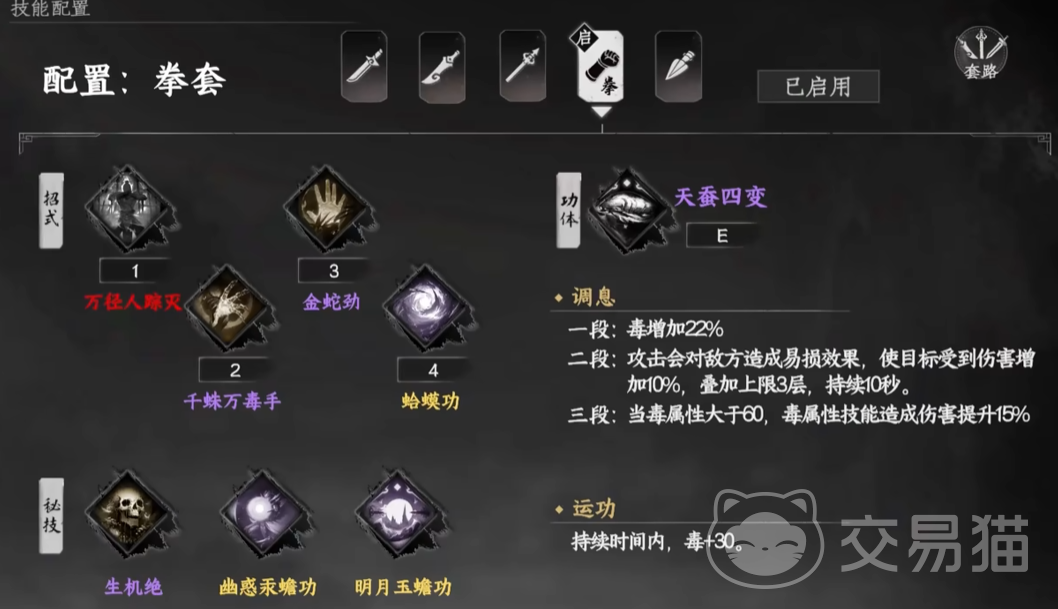 若想进一步提升毒拳的实战表现,还需在装备配置上进行针对性优化。建议优先选用攻速较快的圈类武器,因为中毒层数的叠加频率与攻击次数直接相关,高攻速能更快地堆叠毒性效果,即便单次伤害偏低也无妨。在饰品与经脉属性的选择上,应侧重身法与闪避,提高生存能力的同时维持输出节奏。一旦敌方中毒达到阈值,即使不再主动攻击,其生命值也会因剧毒持续流失而逐渐归零,实现“站着不动也能赢”的压制效果。