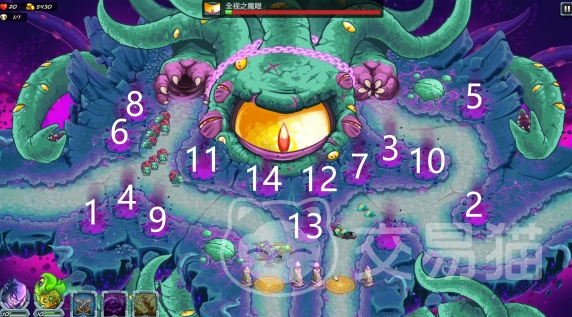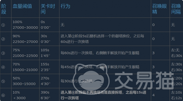 全视之魔眼的基础属性为固定3万血量,护甲和魔法抗性均为0,这意味着常规物理防御塔无法对其造成有效伤害,必须依赖具备魔法输出或特殊机制的单位进行克制。该boss共有六个阶段,阶段转换不仅依赖血量削减,还受时间限制影响——即使未达到血量阈值,只要关卡时间到达指定节点,便会强制进入下一阶段,因此整体节奏控制至关重要。