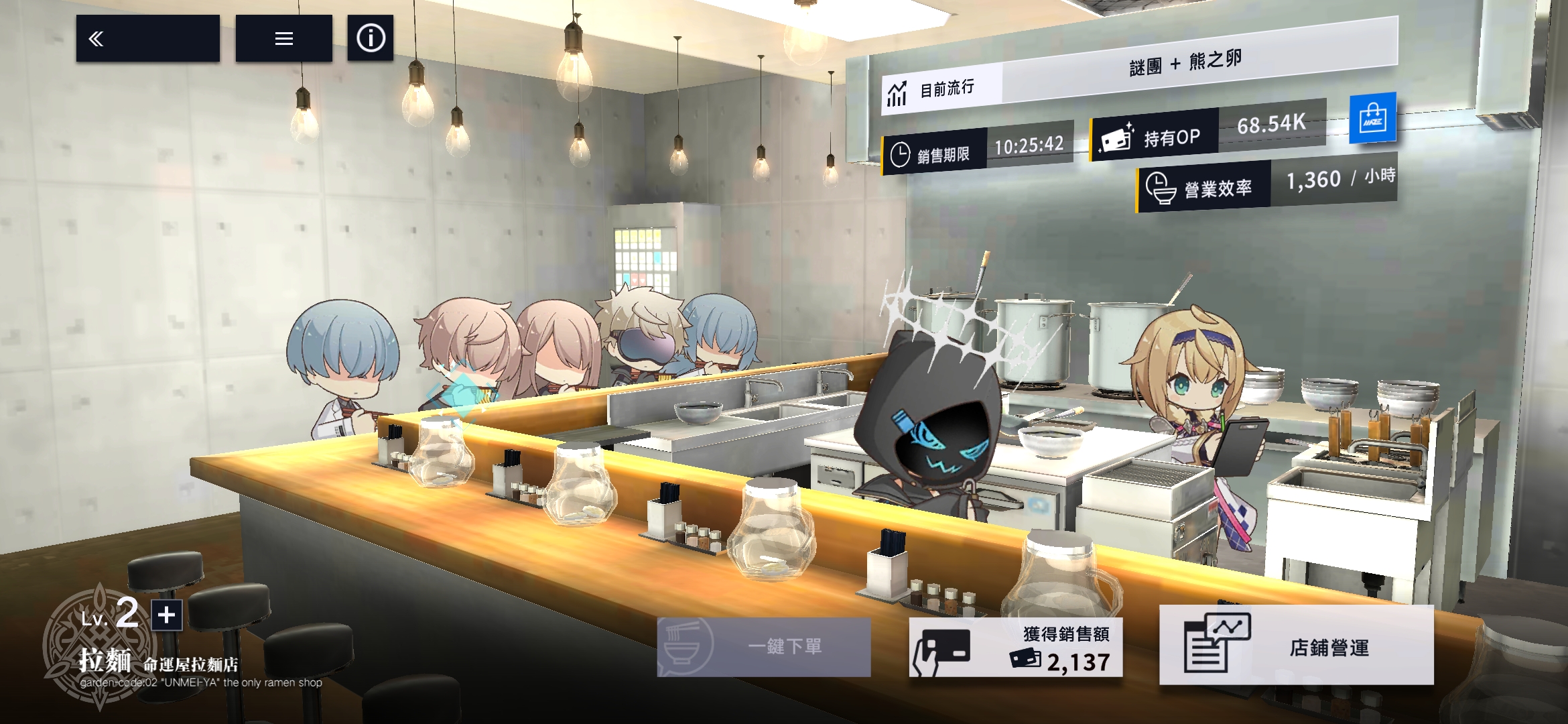 接下来应着手提升拉面店的等级。随着店铺升级,销售效率和商品上架容量都会提高。合理搭配高评分且符合流行趋势的拉面产品,可显著增加营业收入,同时提升骑士的信赖度,并增强助理骑士的协助效果。高等级拉面店更容易满足骑士偏好,提高其光顾频率,从而带来更多收益。