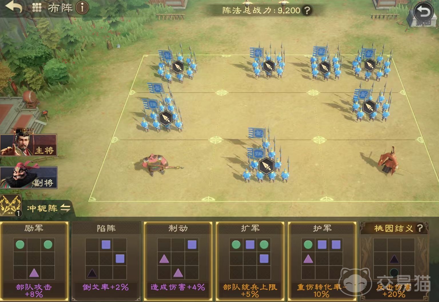 张飞的主动技能允许其向目标区域跳跃并造成范围伤害,同时附带击退效果,配合高额武力成长,具备出色的先手压制能力。其被动可在友军释放技能后概率触发“激战”状态,最多叠加三层,持续提升全队的反击伤害、反击率与反震率。这意味着无论敌方使用普攻还是技能,都会遭到有效反制。觉醒后,张飞在受到技能伤害时还可为部队提供治疗,显著增强队伍的续航能力。因此,在阵法选择上推荐优先配置冲轭阵,该阵法可大幅提升反击率与反击伤害,完美契合反击流打法,尤其克制依赖普攻输出的阵容。阵型方面建议选用扩军、护军、制动或励军来强化前排稳定性。若暂未获取冲轭阵,也可用鹤翼阵作为过渡替代方案。
