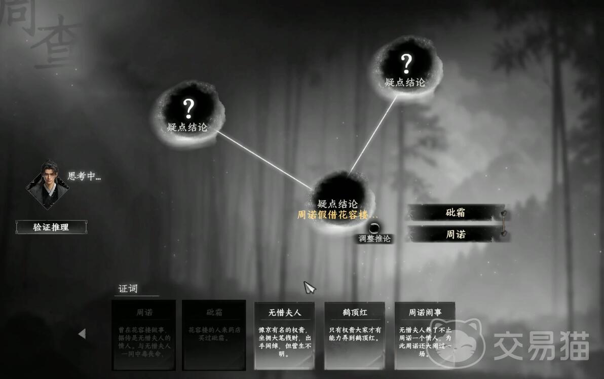 结合所有线索进行推理可知:周诺因感情纠葛心生怨恨,借花容楼名义购买砒霜,暗中投毒致无惜夫人死亡;而无惜夫人察觉对方意图后,也在其茶水中加入鹤顶红予以反击,结果二人双双殒命。当玩家理清整个事件经过后,返回至相饮川处(坐标1476, 464),向其陈述推理结果。作为死者亲属,相饮川对真相十分在意,听完后会对玩家的分析表示认可,并给予相应奖励。