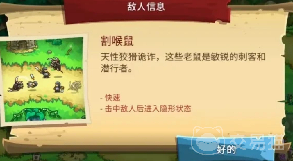 3、割喉鼠:移动速度快,具备隐身机制,在攻击命中后可短暂进入隐形状态。行为诡秘,擅长突袭后排防御塔,需用范围伤害或侦测手段应对。