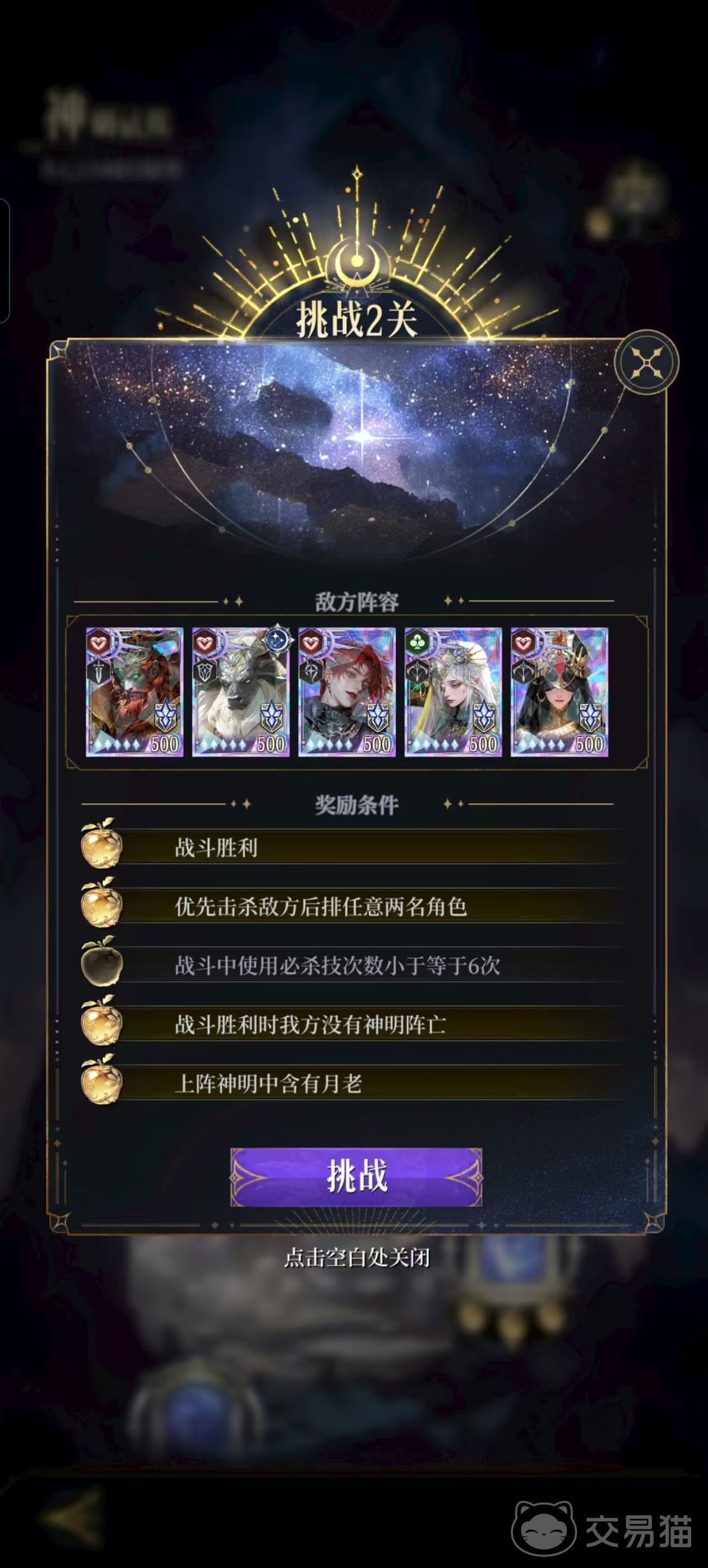 以第二关为例,挑战目标包括:优先击杀敌方后排任意两名角色、整场战斗使用必杀技不超过6次、获胜时我方无角色死亡,以及队伍中必须包含月老。要同时满足这些条件,需配备爆发型刺客快速切入后排,同时搭配具有强大承伤或治疗能力的角色保障生存。再看第三关,要求在30秒内结束战斗、所有上阵神明职业相同、禁用法师与肉盾类型,并且同一友方角色需击败至少三名敌人。这显然需要围绕一名输出极强的核心主C构建阵容,其余位置全部配置辅助类角色,以便为主C创造良好的输出环境并加速清场。