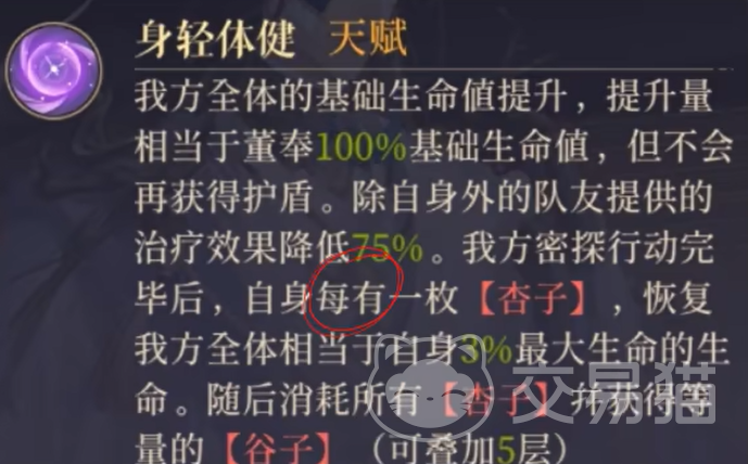 在天赋设计上,“身轻体健”赋予全队基础生命值加成,进一步强化生存上限。此外,每当董奉完成一次行动,系统会根据当前持有的“杏子”数量,按其最大生命值的一定比例为全体成员恢复血量。这一机制实现了长效治疗覆盖,使他在长时间战斗中具备出色的持续支援能力。